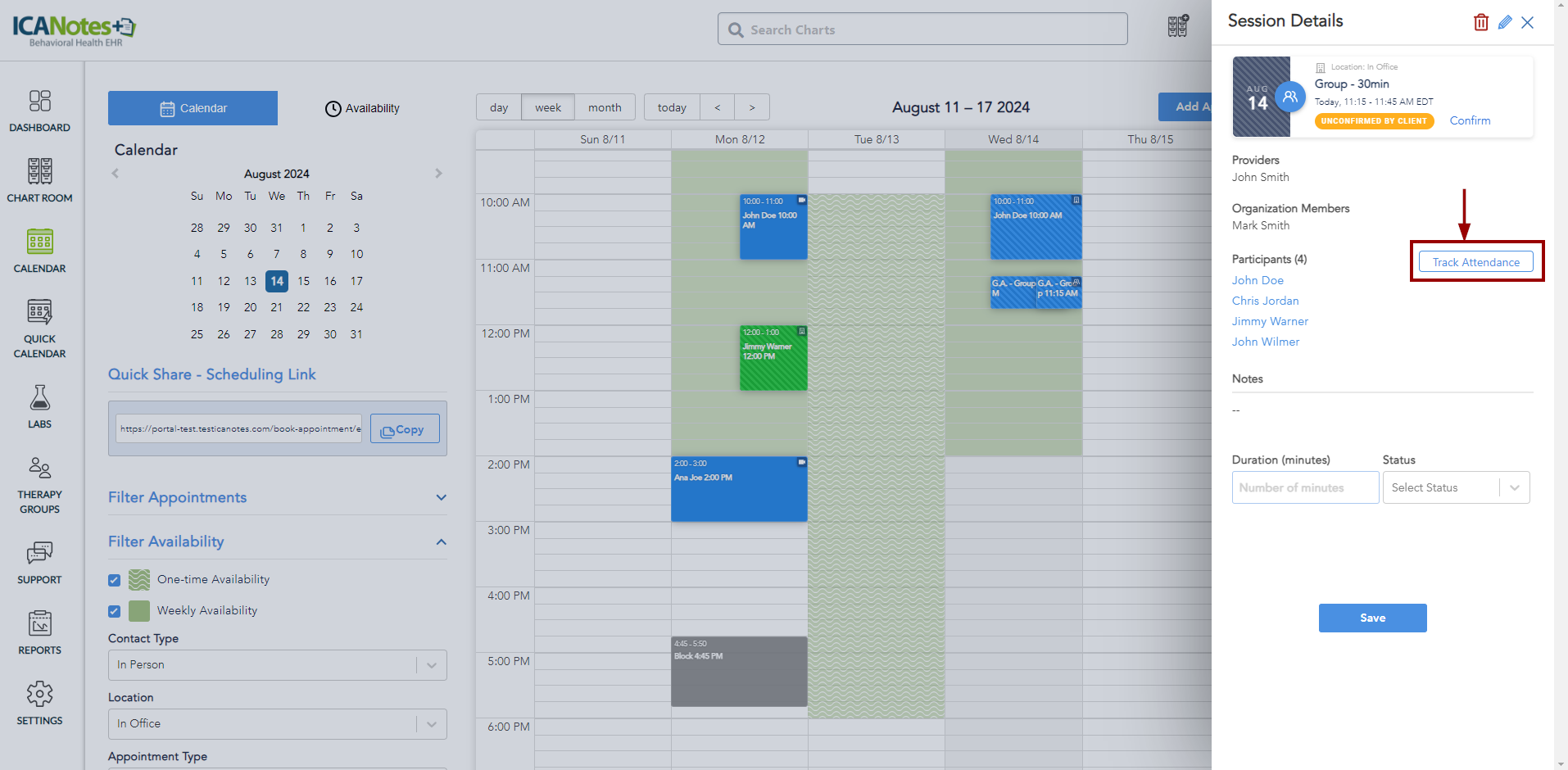 You can record the attendance of participants who attended the session from two locations: the Calendar and the Therapy Group screen.