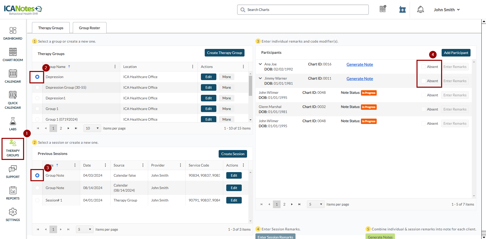 Overview After assigning roles and permissions to designated users and configuring the therapy group details, you can record information in the therapy group module. This allows you to manage sessions and participants, enter individual and session ...