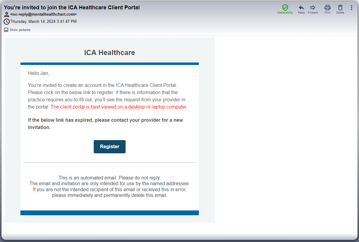 When you send an invitation to your clients to register for the client portal, the link expires after 7 days if they haven't registered. However, ICANotes+ offers the option to resend the invitation to your clients after the original link has expired.