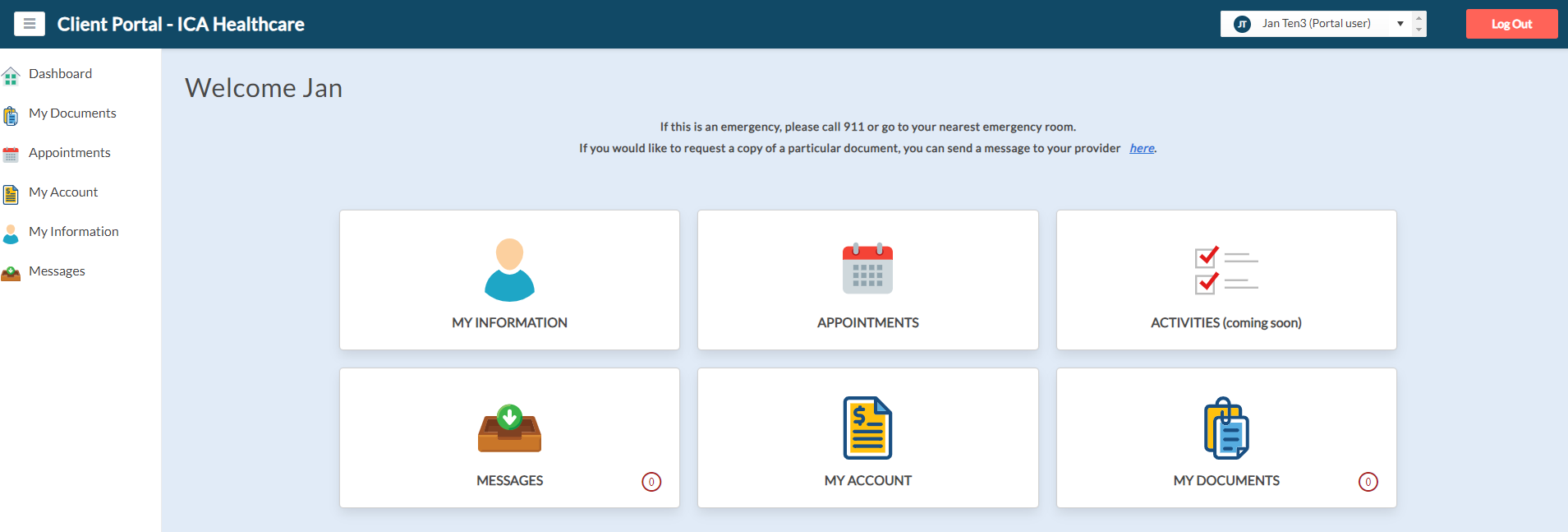 After successfully logging into the client portal, clients will encounter the following screen. Clients can then proceed to execute necessary tasks such as accessing documents sent by the practice, submitting appointment requests, checking balances, and more.
