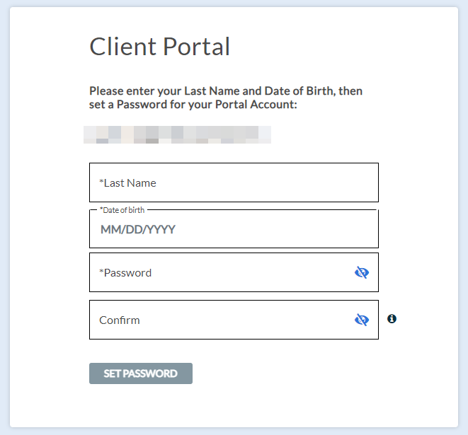 When clients click on the link, they'll be directed to a screen where they can enter their last name, date of birth, and set a password. It's important to ensure that the information entered in the last name and date of birth fields matches the records in ICANotes+ under the client's chart.