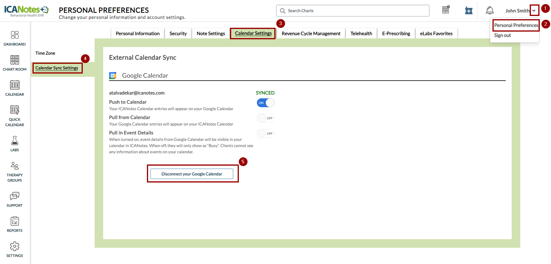 Once you follow the above steps to remove syncing, you can sync ICANotes+ calendar with Google calendar once again. To sync it again, refer to this KB article: How to Sync Google Calendar with the ICANotes+ Calendar.