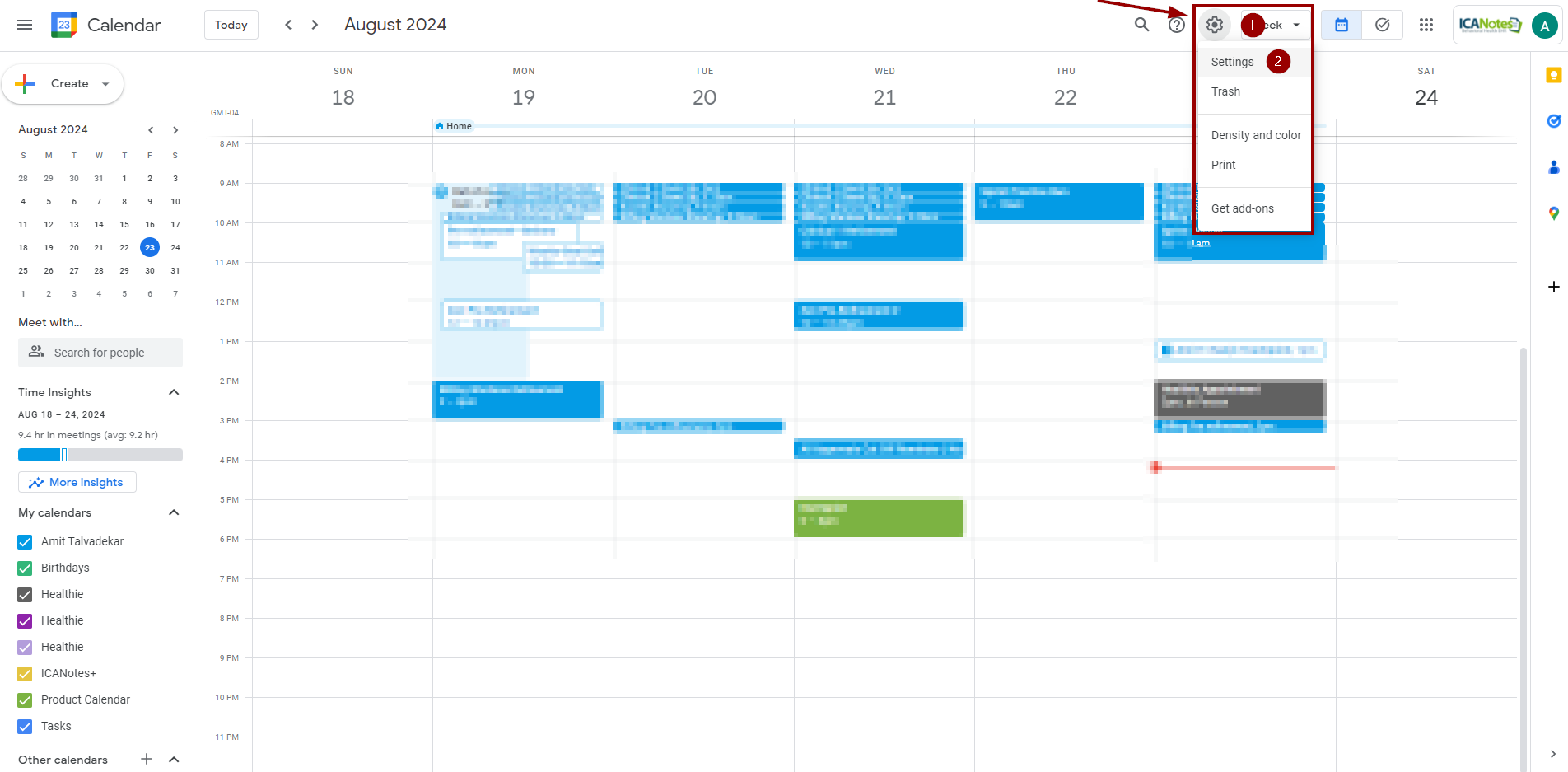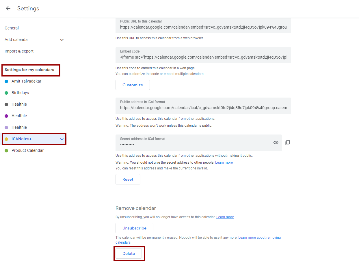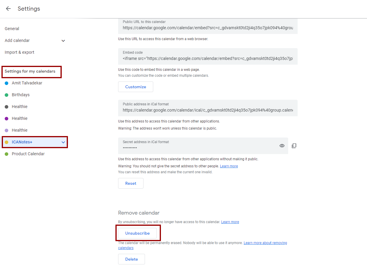 If you have synced and unsynced your calendar with ICANotes+ multiple times, you may notice several 'ICANotes+' calendars listed in Google Calendar.