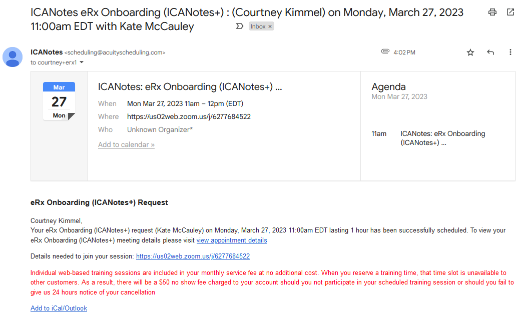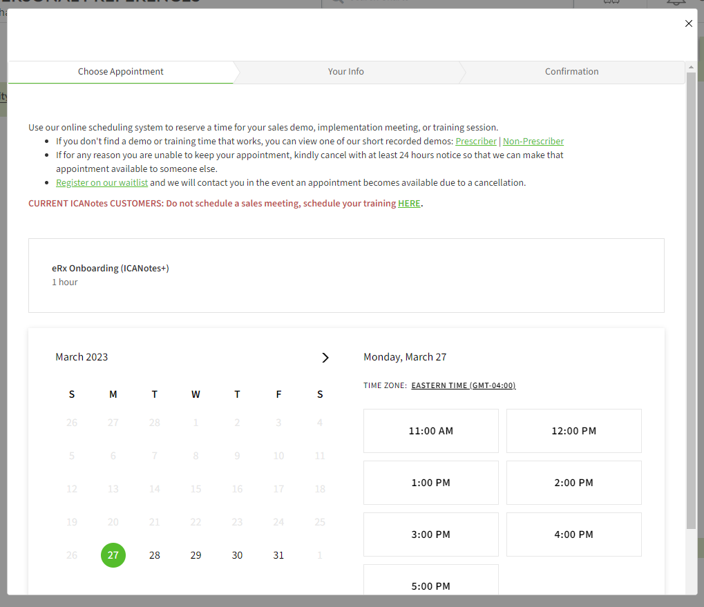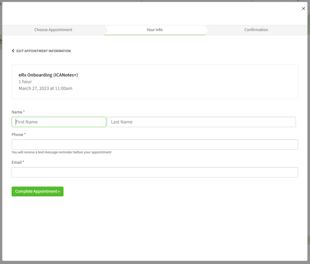 After selecting the date and time, you will be prompted to fill out your contact information. When done, click Complete Appointment to confirm and schedule your meeting with our eRx onboarding team.