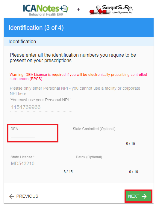 Enter all the identification numbers you require to be on your prescriptions in step 3. You must enter a DEA License number in order to e-prescribe controlled substances. Click NEXT when done.