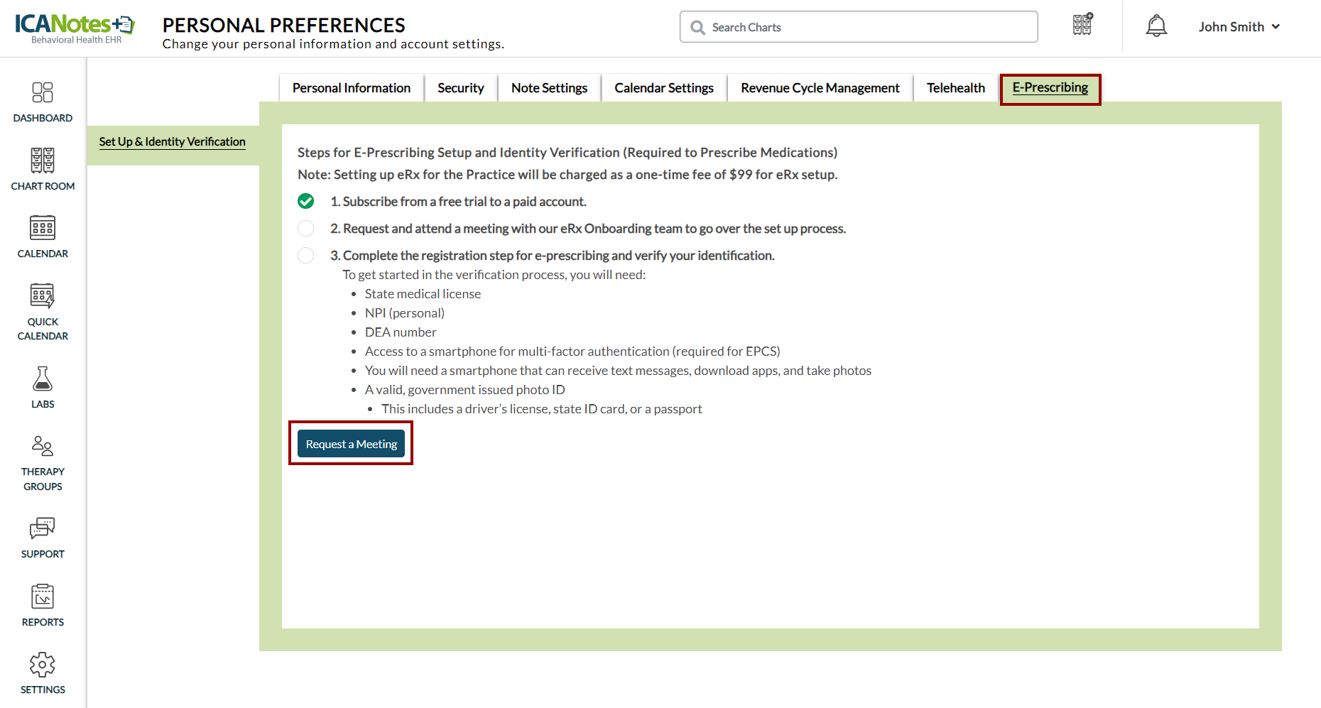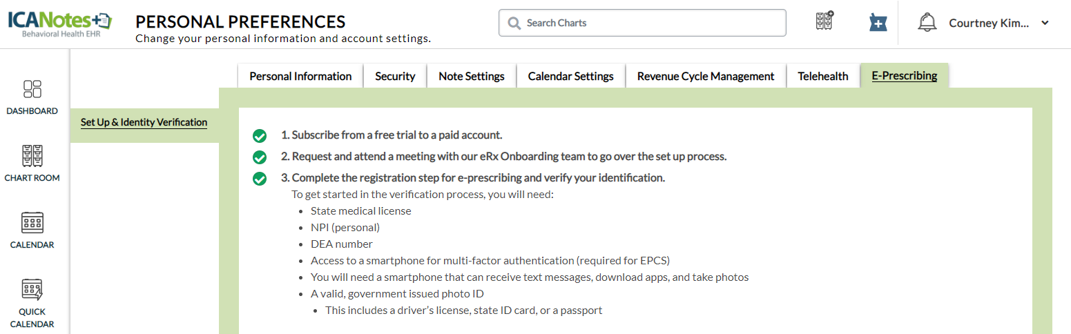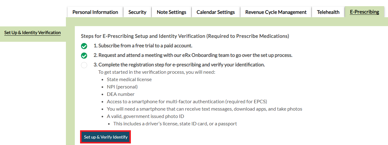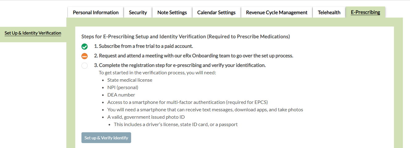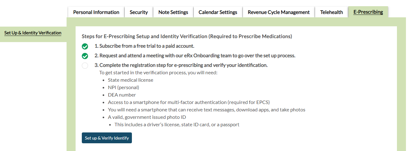 Back on the E-Prescribing tab within Personal Preferences, click the Set up & Verify Identity button to proceed.