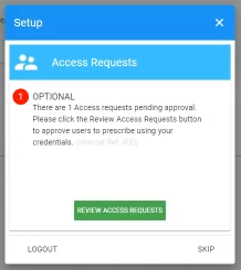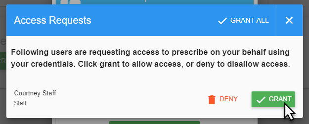 You will see the staff administrator listed in the lower left corner of the Access Requests window. To allow this user access to eRx and to prescribe on your behalf, click the Grant button.