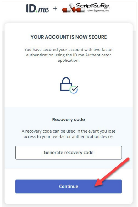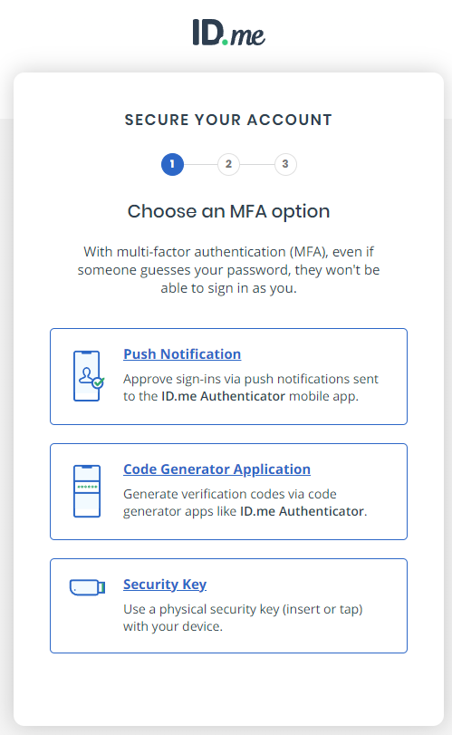 Multi‐factor authentication adds an additional layer of security to your account. For future ID.me logins, you will authenticate with the method you setup in this step. Be sure to use a device you plan to have on your person when e‐prescribing.