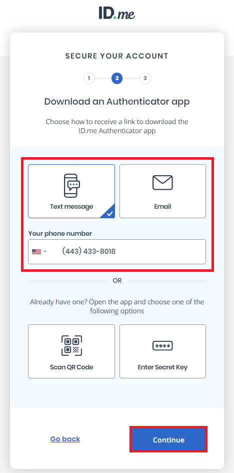 Upon making your selection, you will be prompted to download the ID.me Authenticator app on your smartphone or tablet. Follow the on‐screen prompts to download the app and click Continue.