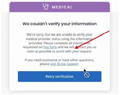 If ID.me is unable to verify your identity via self‐serve workflow, you will see a RETRY button. Select RETRY to proceed. You may choose a different verification method than on your previous attempt or attempt the same method again. You must RETRY verification to continue.