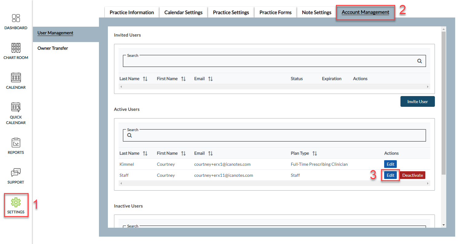 To set up a staff admin with eRx permissions, navigate to Settings > Account Management and use the Edit button next to the staff user's name.