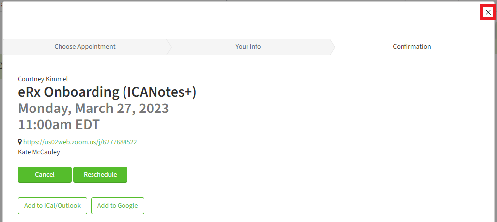 You will see confirmation that your meeting has been scheduled. You have the option to add this to your calendar, cancel, reschedule, or simply use the X to close this window.