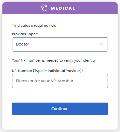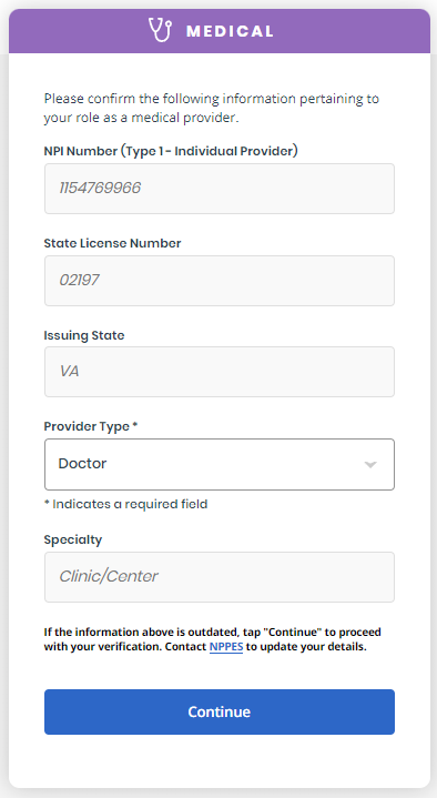 Next, verify your medical credentials (NPI/DEA). Enter your Provider Type, NPI Number, State and DEA Number (for EPCS) then click Continue.