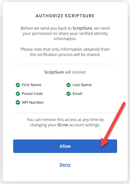 The last step is to select Allow, authorizing ScriptSure to receive your verified identity information and enable eRx in ICANotes+.