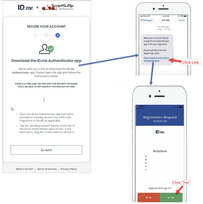 Follow desktop and smart device prompts to download and configure the ID.me Authenticator. You will receive a text message or email with a link to download the ID.me Authenticator app. Open your text messages/email and click the link to get started with app download. Follow on‐device prompts to complete setup. Be sure to click or tap on the green “Yes” to complete your setup (if you chose to set up Push Notifications).