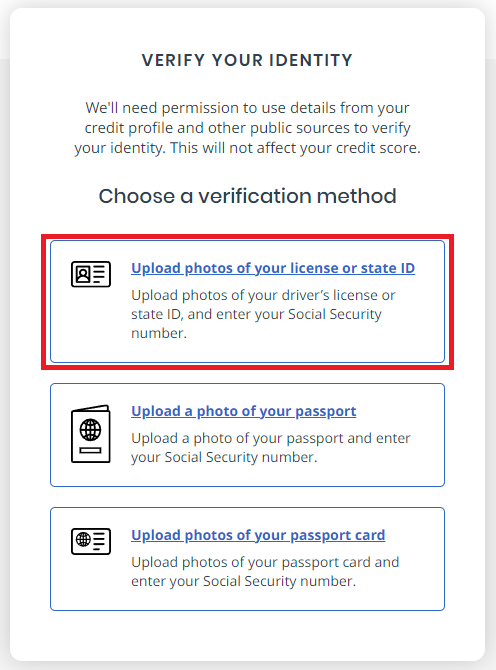 Next, you'll need to verify your identity. Choose the method you prefer to verify your identity. You will be asked to prove that you are who you say you are by providing evidence such as uploading a photo ID and taking a live selfie. You will also be asked to enter your SSN. Information entered into ID.me’s workflow is encrypted while at rest and in‐transit and completing the verification process will not hurt your credit score.