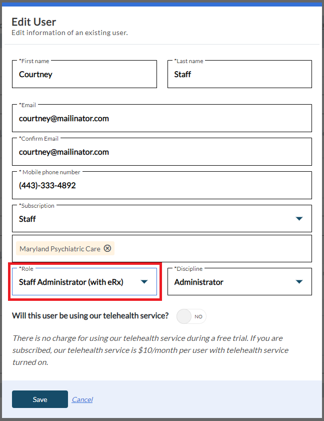 The role for the staff user must be listed as Staff Administrator (with eRx) to approve the provider for EPCS.
