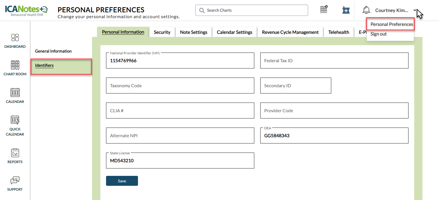 Before beginning the steps below, providers should ensure their NPI, State License and DEA (required if setting up EPCS for prescribing controlled substances) are set up in their Personal Preferences.
