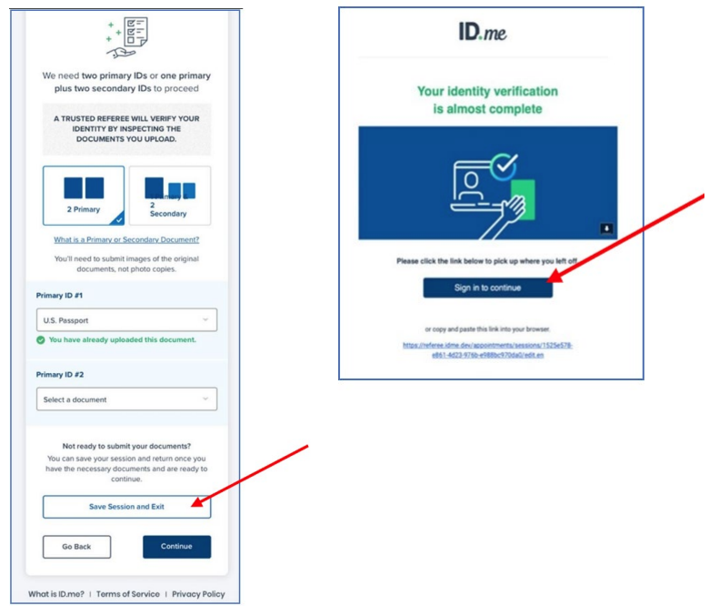 If you don’t have the documents needed on‐hand, use the SAVE SESSION AND EXIT button at the bottom of the screen to save your spot in the workflow. You will be sent an email with a link to click in order to return to the same spot in the workflow (with the documents and/or selfie you have uploaded saved).