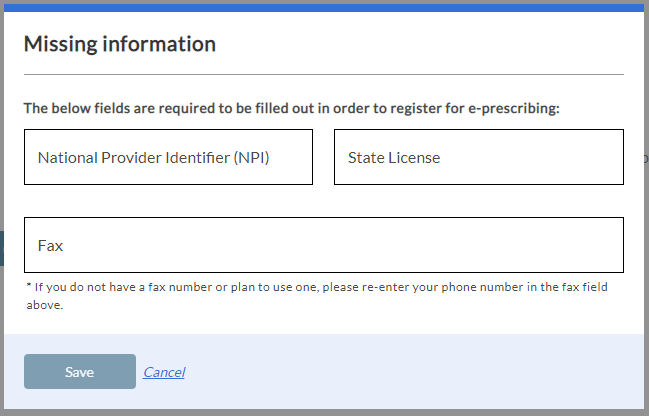You will be prompted to complete missing information, if needed. These fields are required and must be completed to continue with set up. Click Save when ready.