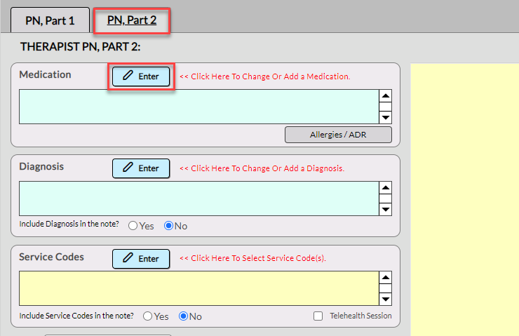 The staff user will navigate to a client chart open a Progress Note. Continue to PN, Part 2 and select the Enter button next to Medications.