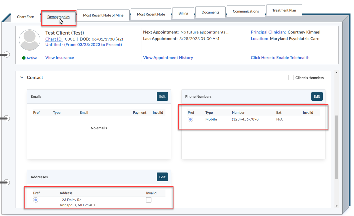 The provider will navigate to a client chart and make sure the client has an address and phone number listed in demographics (these are required before you can access eRx for a client). Use the Edit button to add or make changes to these fields.