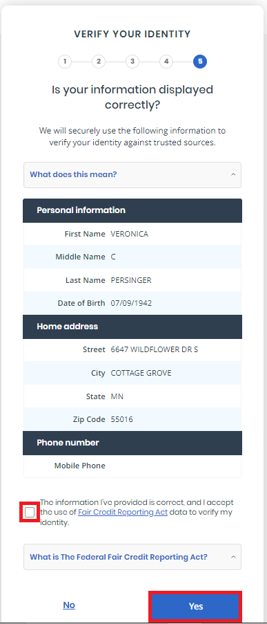Review to confirm your information is displayed correctly and check the box to confirm before clicking Yes to continue.