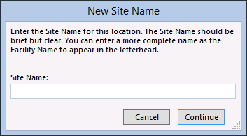 In the New Site Name pop-up, give the site a name you'll easily distinguish as your Telehealth site. Please note that once the Site Name is set, it cannot be updated (and is largely used for internal purposes only). You will have an opportunity to set the Facility Name for your Telehealth site in the next step.