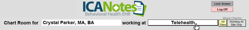 Before creating a note for the telehealth encounter, be sure to set your Working At location in the Chart Room first. To set this, click into the Working At dropdown and select your telehealth site.