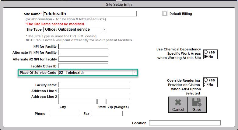 In the next Site Setup Entry pop-up, enter all information as it pertains to the Telehealth site, including Site Type, facility NPI(s), Facility Other ID (if applicable) and Place of Service Code. For Telehealth purposes, the Place of Service Code should be 02 - Telehealth. Complete the Facility Name, address, and phone/fax numbers as necessary.