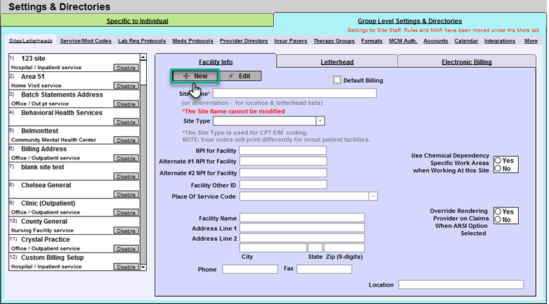 Click into Group Level Settings & Directories and stay within the Sites/Letterheads tab. Under Facility Info, click to create a New site.