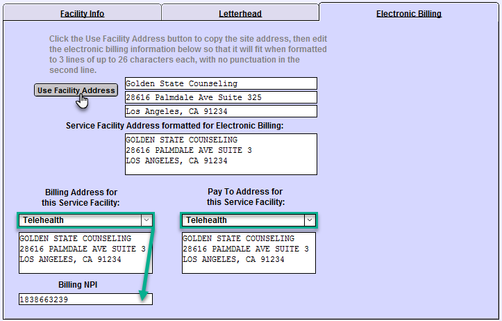 Next, click into the Electronic Billing tab. Follow the same step of clicking Use Facility Address to populate it into the Address field.