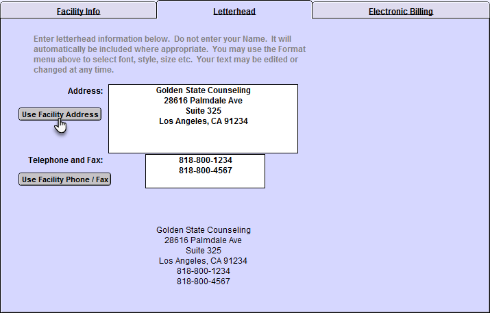 To populate the letterhead, simply click Use Facility Address and Use Facility Phone/Fax. All relevant information entered in the Facility Info tab will copy over. If at a later time you update information in the Facility Info tab, don't forget to re-populate it in the Letterhead and Electronic Billing tabs.