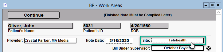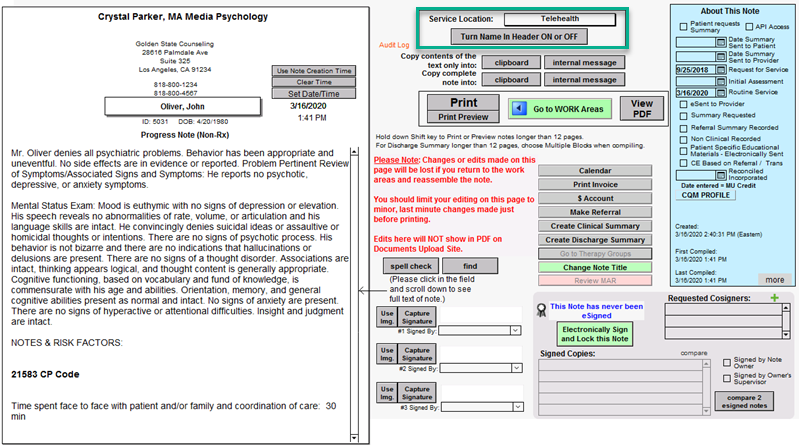 When compiling/saving your note, the Service Location will be set to the Telehealth site: