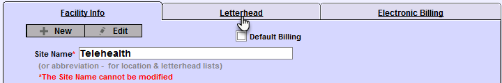 Once Facility Info is set for the new telehealth site (click Edit to continue making changes as needed), navigate into the Letterhead tab.