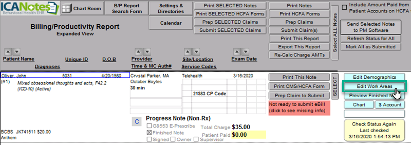 The Service Location can also be set from the Billing/Productivity Report using the Edit Work Areas button within the report: