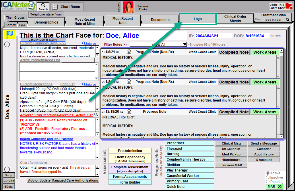 If you've been tracking Vital Signs using the Vital Signs button in PN Part 1, you can bring up a visual log of this data over time using the Vital Signs Log. To bring up this log for a patient, open up their Chart Face, and look for the Logs tab at ...