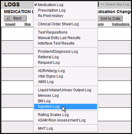 2. On the medication tab, click the dropdown list and select Injection Log.