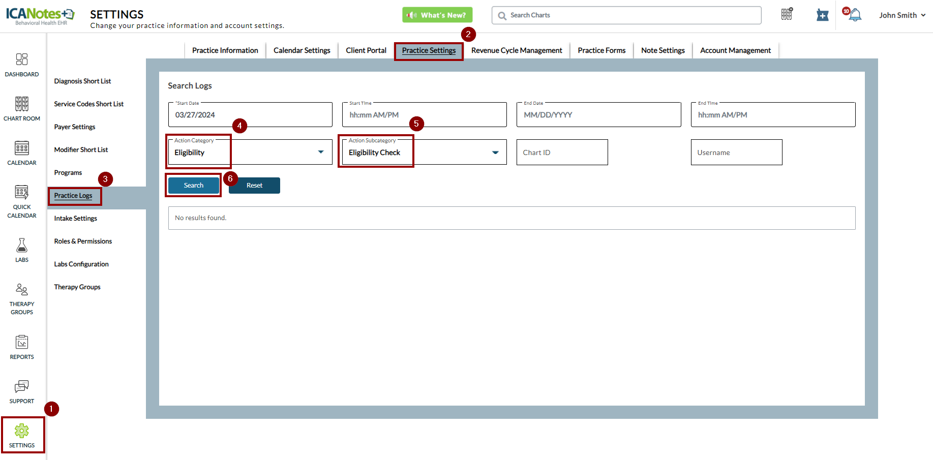 Whenever the client's insurance eligibility is performed, the system generates a log for this action. You can review these entries in the Practice Logs section.