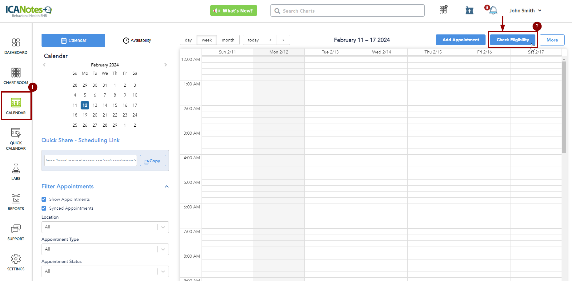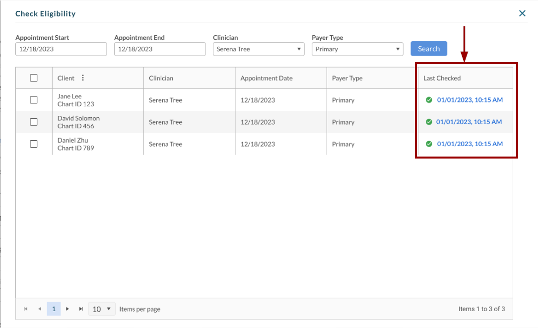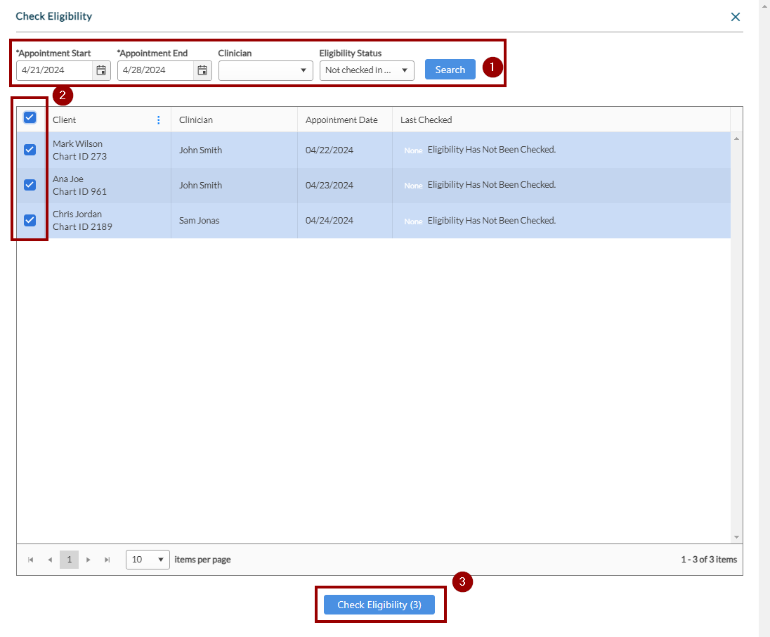 On the Check Eligibility screen, you can filter the clients based on their appointments, clinician, and eligibility status.
