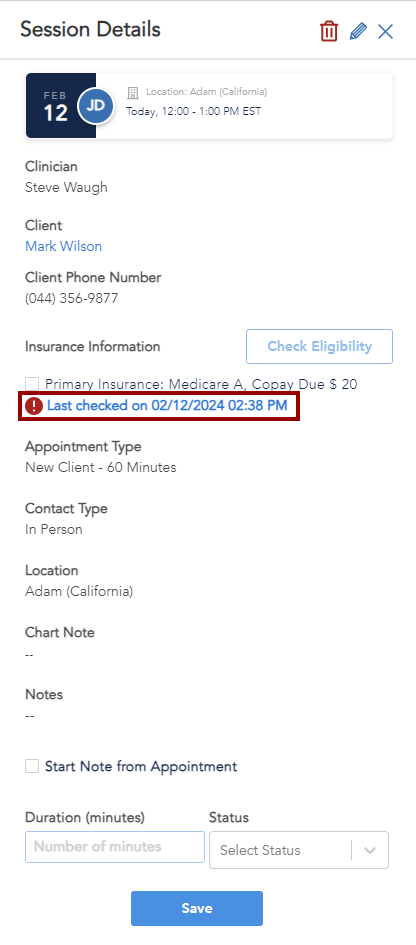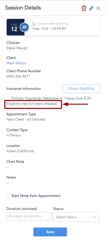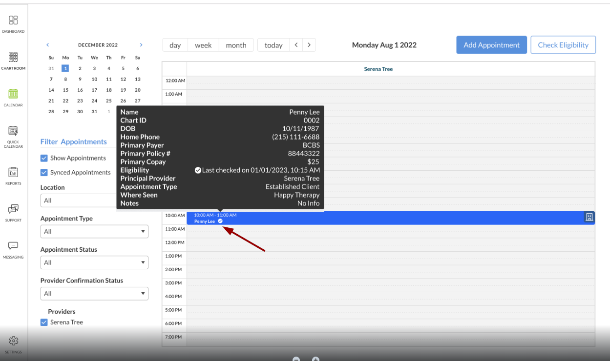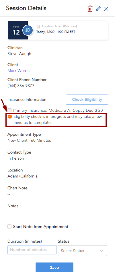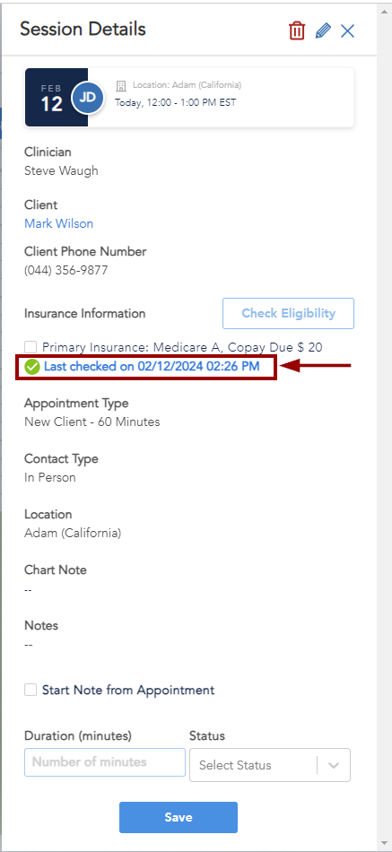 You can check the last eligibility performed details for a single client as shown in the screen below. On the Calendar, an icon will appear next to the booked appointment. When you hover mouse over this icon, the tool tip will appear to display the last eligibility check details.