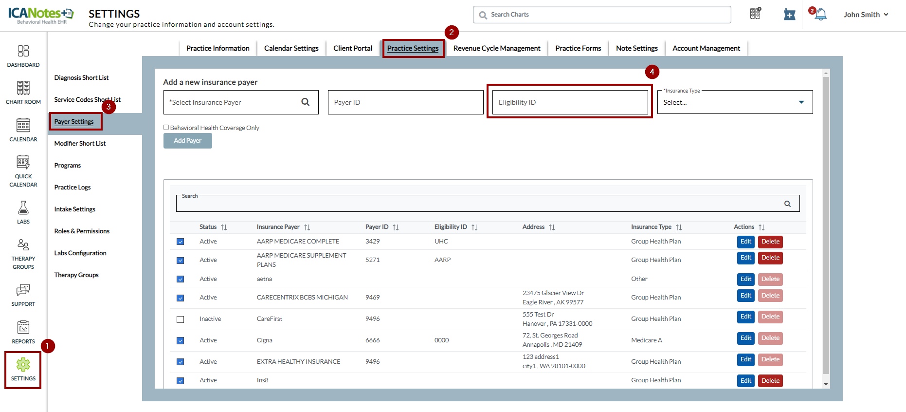 When adding an insurance payer in the system, locate the Eligibility ID field as shown in the screen below. This field is used by the clearinghouses to map an eligibility request with the specific payer. Navigate to Settings > Practice Settings > Payer Settings to locate the Eligibility ID field.