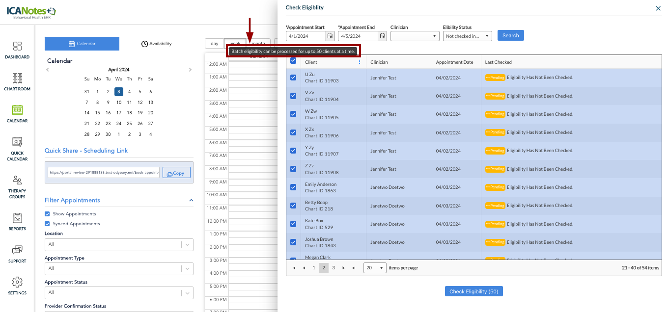 When verifying insurance eligibility for multiple clients, you can choose a maximum of 50 clients simultaneously. To include additional clients, you'll need to clear out some from the batch. When you try to select more than 50 clients, a tool tip will appear as shown in the screen below: