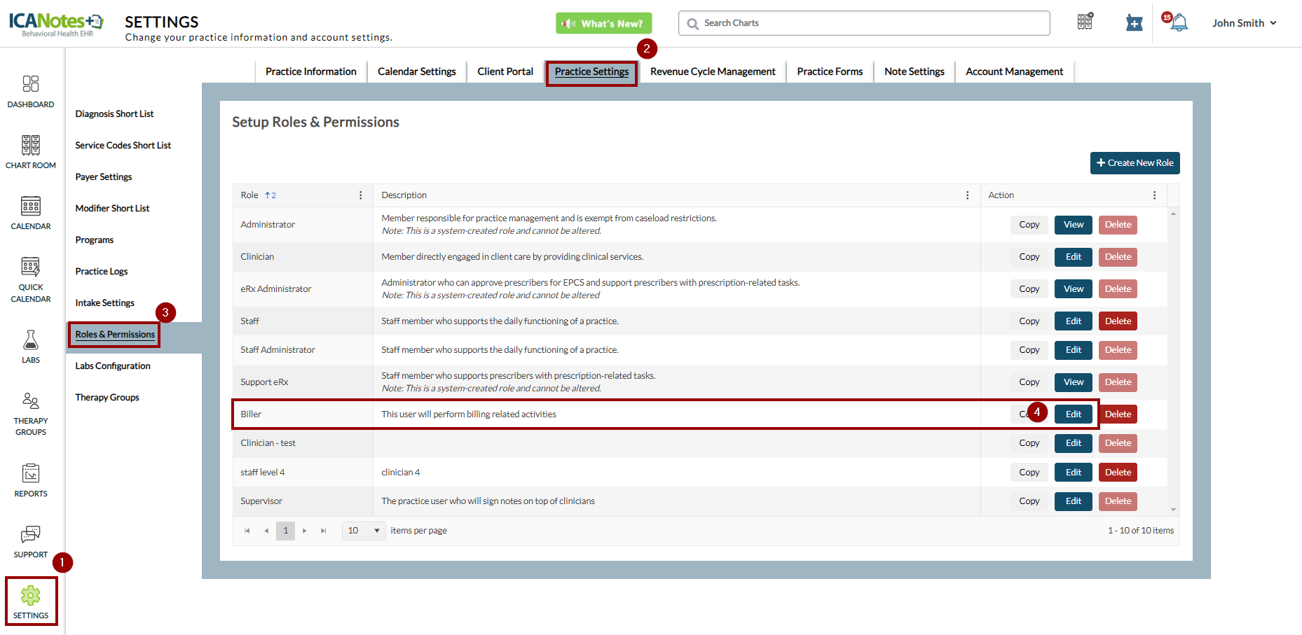 To manage permissions, navigate to Settings > Practice Settings > Roles & Permissions, and then click on the Edit button as illustrated below.