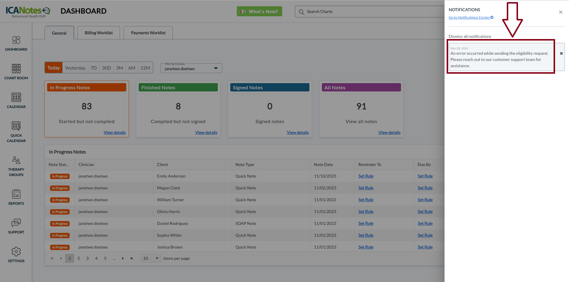 ICANotes+ provides the capability to verify insurance eligibility for clients through two methods: Individual and Batch Processing. This feature covers all insurance types - primary, secondary, and other insurances. During the eligibility verification process, you can also view the date of the last eligibility check performed. Logs for these checks are available in the Practice Logs section. In the event of an error during eligibility verification, a notification appears on the Notifications screen.