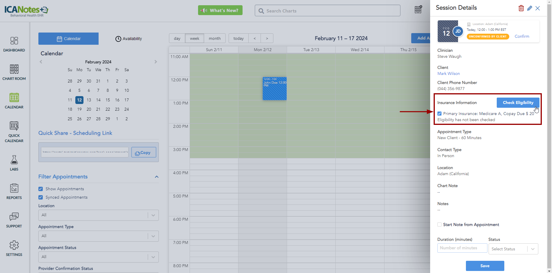 When scheduling appointments for your clients via the calendar, navigate to the Insurance Information section, where you can view all the insurances associated with the client, including primary, secondary, and other coverage. Choose the relevant insurances and then click the Check Eligibility button to confirm the client's insurance eligibility.