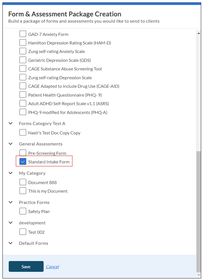 2. On the Form & Assessment Package Creation screen, enter the name of the Package Title on top of this screen, select the Standard Intake Form checkbox, and click Save.