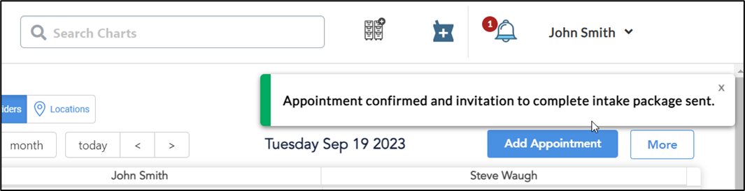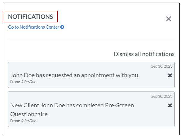 13. When you click the bell icon, the Notifications screen will appear to notify you that the client has requested and appointment and completed the pre-screening process.