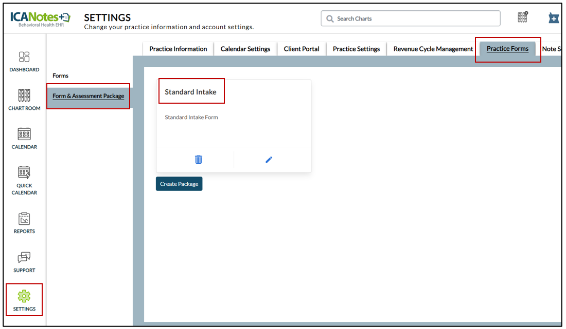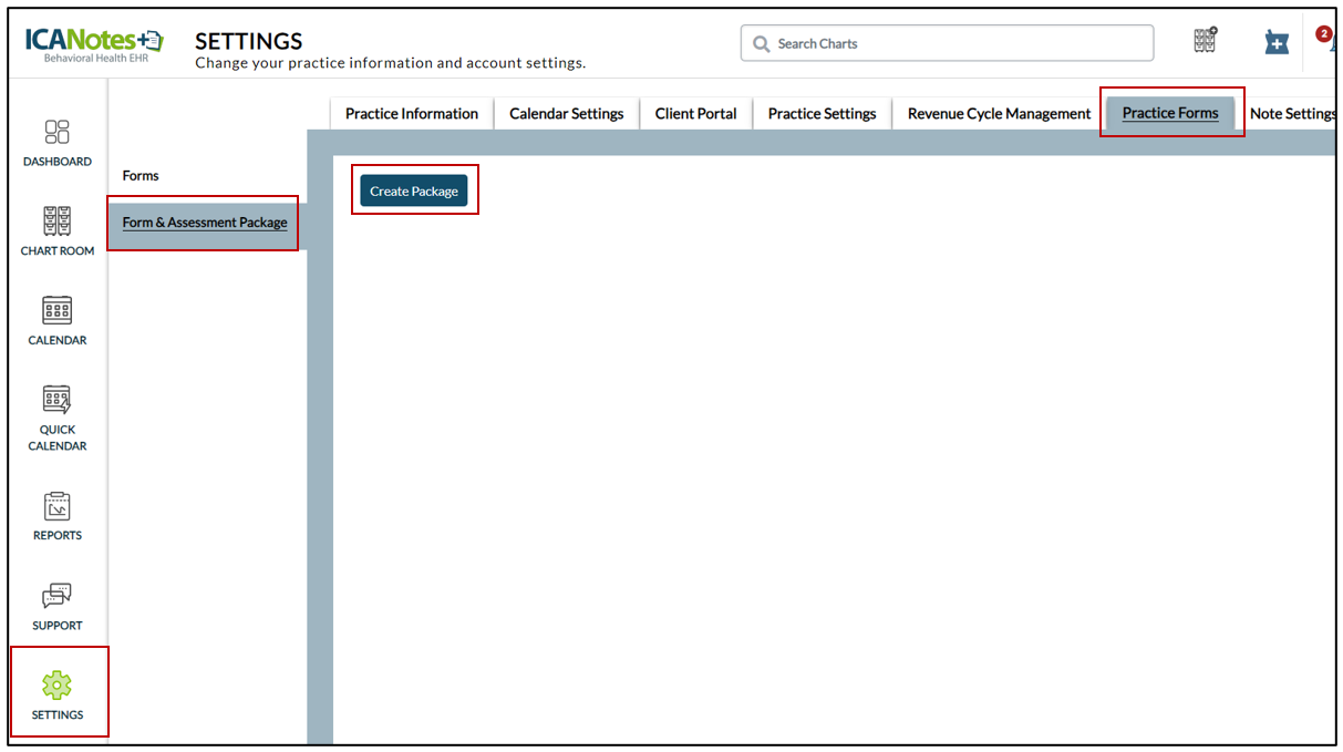 1. In the bookmarks on your left, click Settings. Select the Practice Forms tab from top. Select the Form & Assessment Package from the left menu and then click the Create Package button.