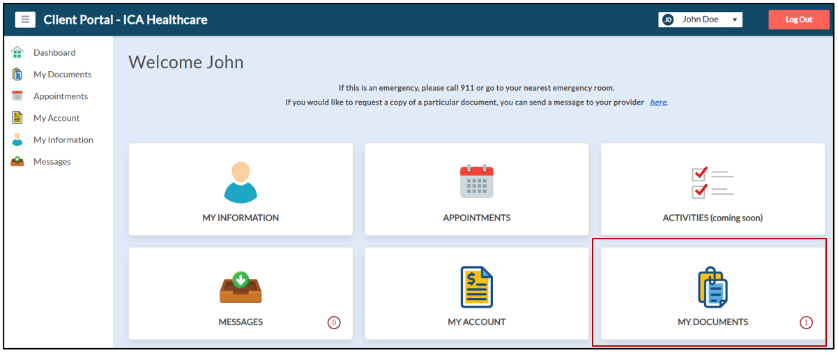 21. On the landing page, the client can click the My Documents section as shown below.